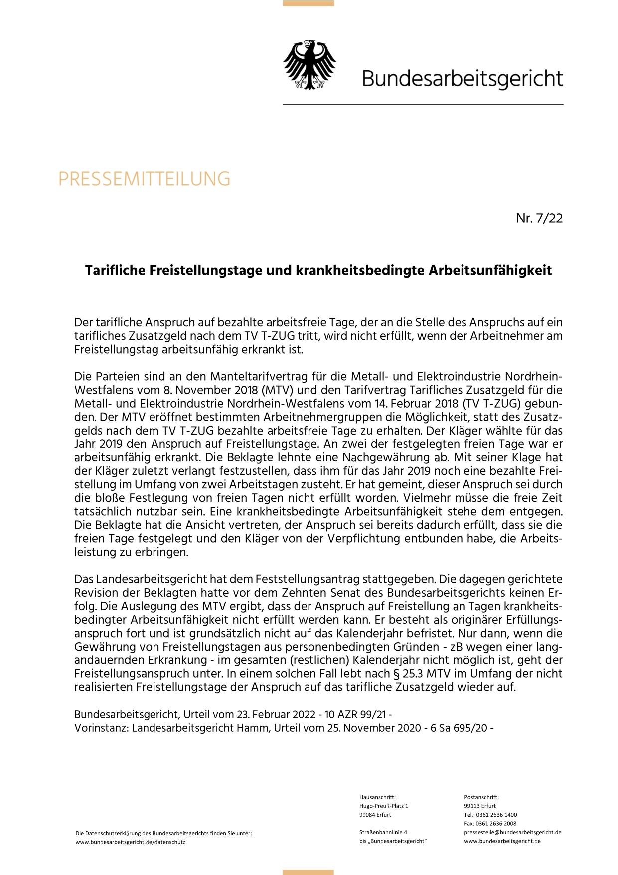 Presseerklärung des BAG zu Verfall T-Zug Tage bei Krankheit