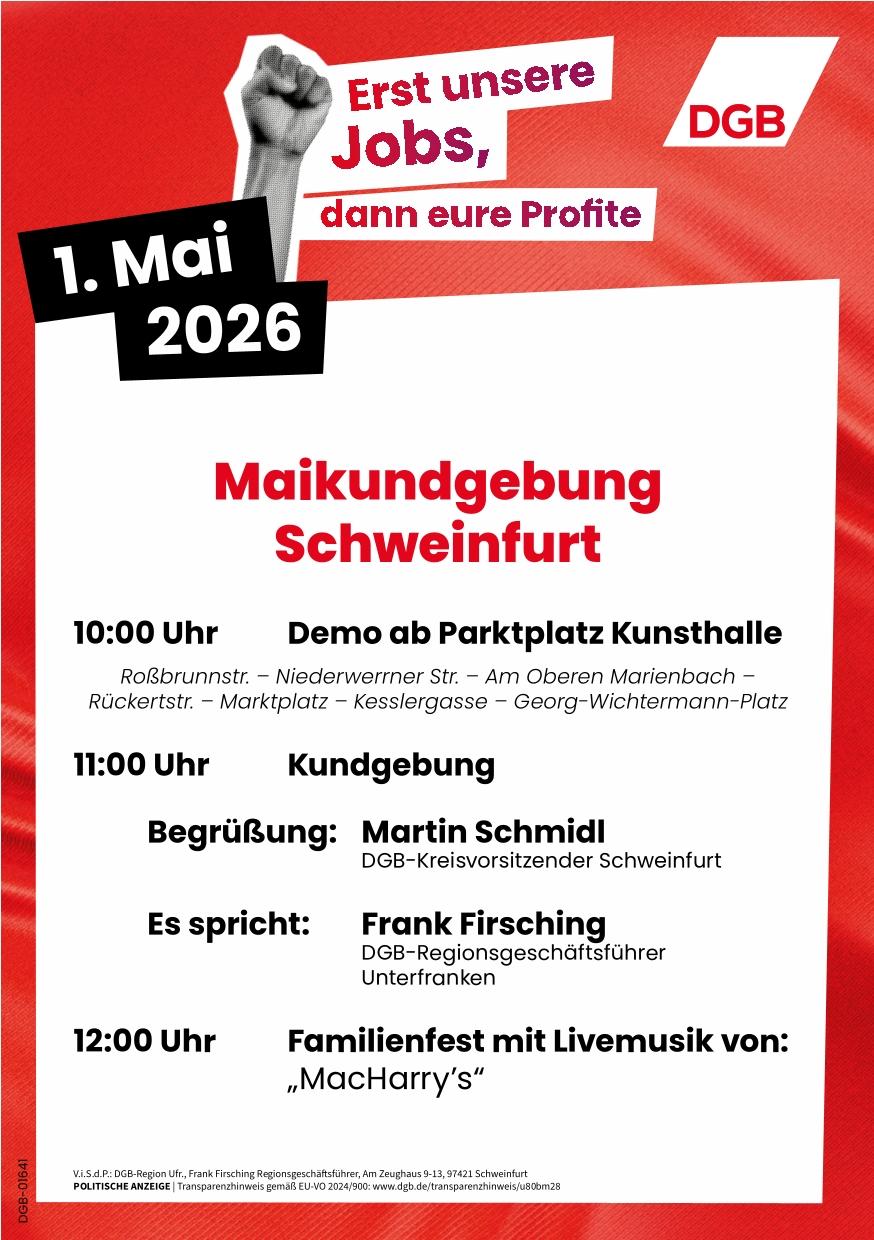 Unter dem Motto „Erst unsere Jobs, dann eure Profite“ ruft der Deutsche Gewerkschaftsbund zum Tag der Arbeit bundesweit zu hunderten Kundgebungen auf. Allein in Bayern finden zum 1. Mai insgesamt 78 Veranstaltungen statt.