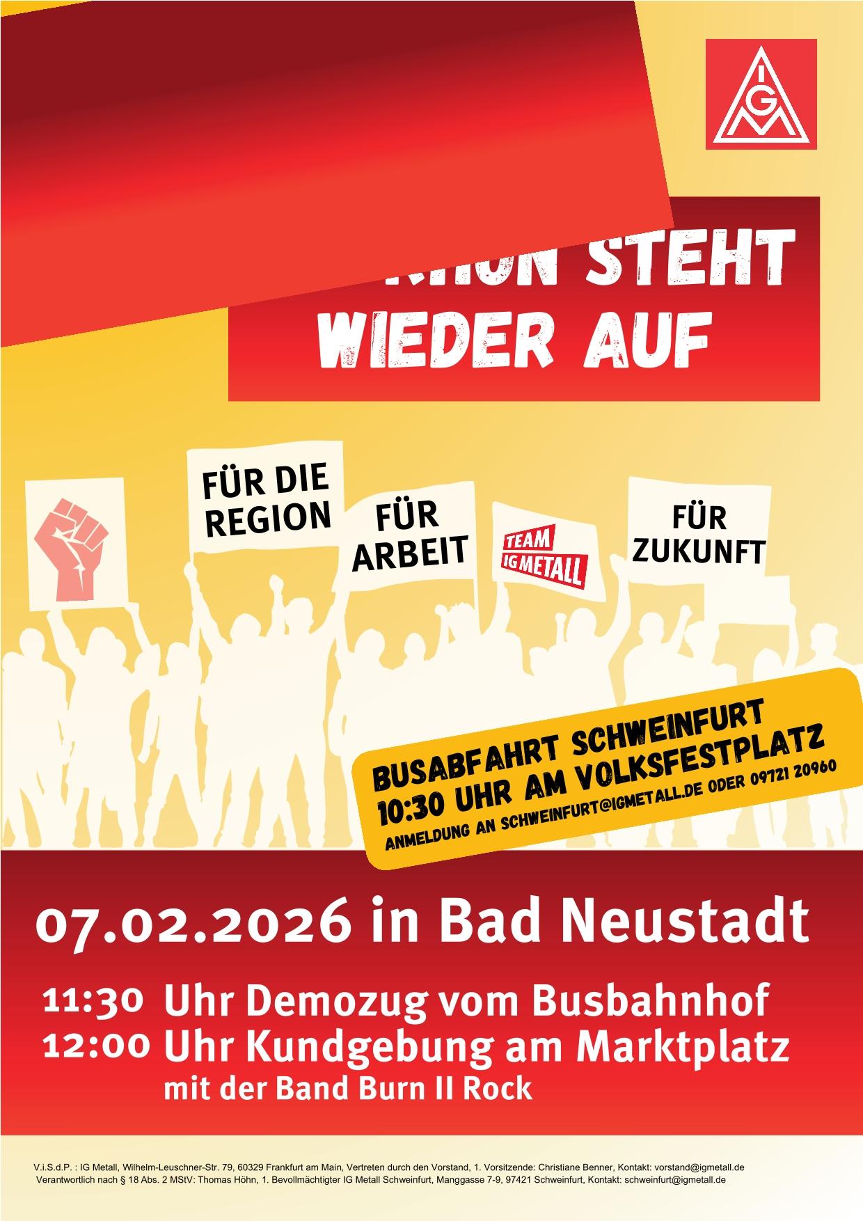 Thomas Höhn, Geschäftsführer der IG Metall Schweinfurt, erklärt dazu: „Vieles was wir heute in Bad Neustadt an der Saale sehen, wurde gemeinsam erkämpft – von einer Region, die verstanden hat, dass industrielle Wertschöpfung die Grundlage für gute Arbeit, gesellschaftlichen Zusammenhalt und Zukunftschancen ist. Wenn heute Konzerne das ohne jeden Bezug zur Region verantwortungslos aufs Spiel setzen, dann dürfen wir das nicht hinnehmen. Die Rhön hat immer bewiesen, dass sie Flagge zeigen kann. Das brauchen wir jetzt wieder – 2026.“